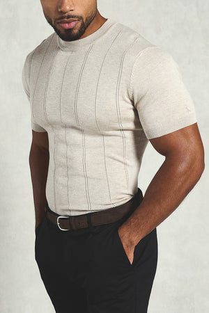 Finally—a knit tee that fits like it was made for you. Designed for men with broad shoulders and narrow waists, this Muscle Fit Vertical Stripe Knitted T-Shirt enhances your chest and arms while tapering cleanly at the waist. Crafted from super-soft yarn with refined vertical stripes, ribbed trims, and precision fashioning at the armhole, it delivers elevated style without sacrificing comfort.